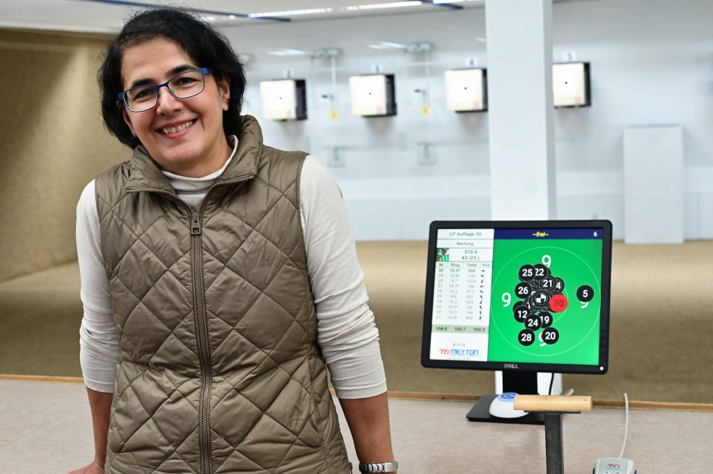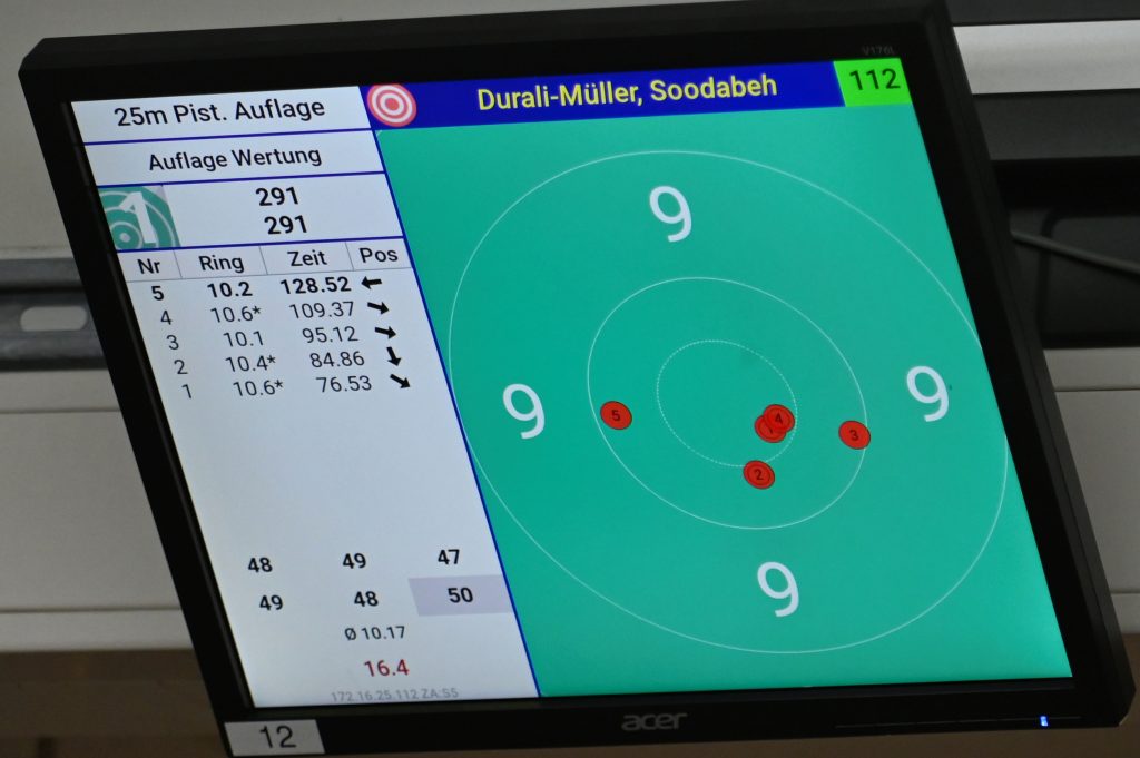 Kurz vor 17 Uhr: Der letzte Durchgang läuft, und Soodabeh schaut gespannt auf die Ergebnisse der verbliebenen Pistolen-Schützinnen.