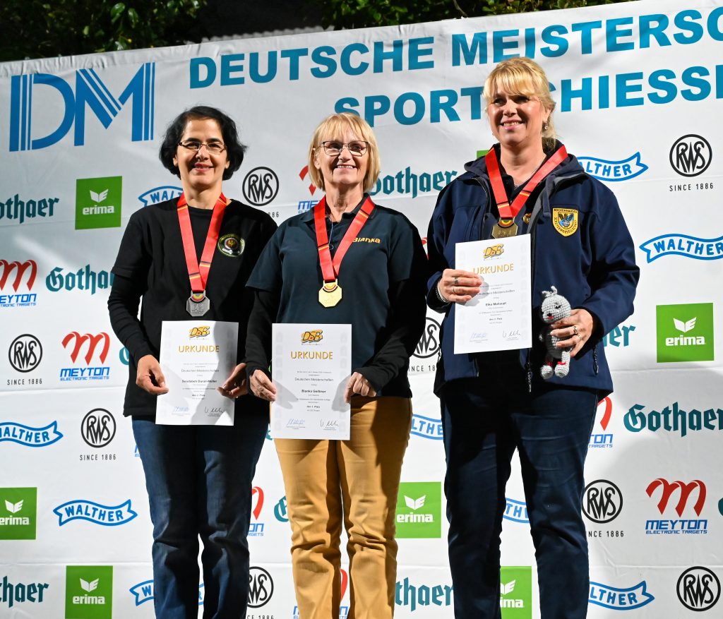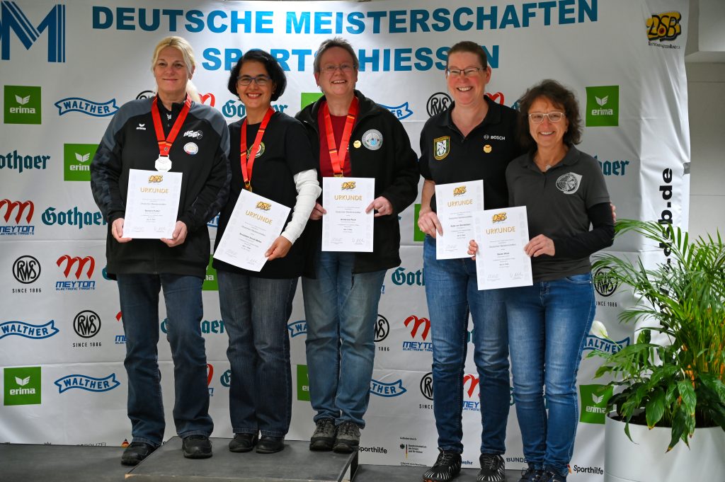 Die Siegerinnen der Deutschen Meisterschaft in der Disziplin Luftpistole Auflage Seniorinnen I: Soodabeh Durali-Müller (2.v.l) konnte sich in einem spannenden Wettkampf ringgleich, aber mit besserer dritter Serie, gegen die Titelverteidigerin Barbara Kutzer (1.v.l) aus München durchsetzen und holte den Titel. Auf Platz drei schaffte es Annerose Peck aus Enzberg (3. v.l.), Platz fünf ging an Katja von Bardeleben vom SV Dieringsen. Beate Wink (rechts) erreichte den 6. Platz.