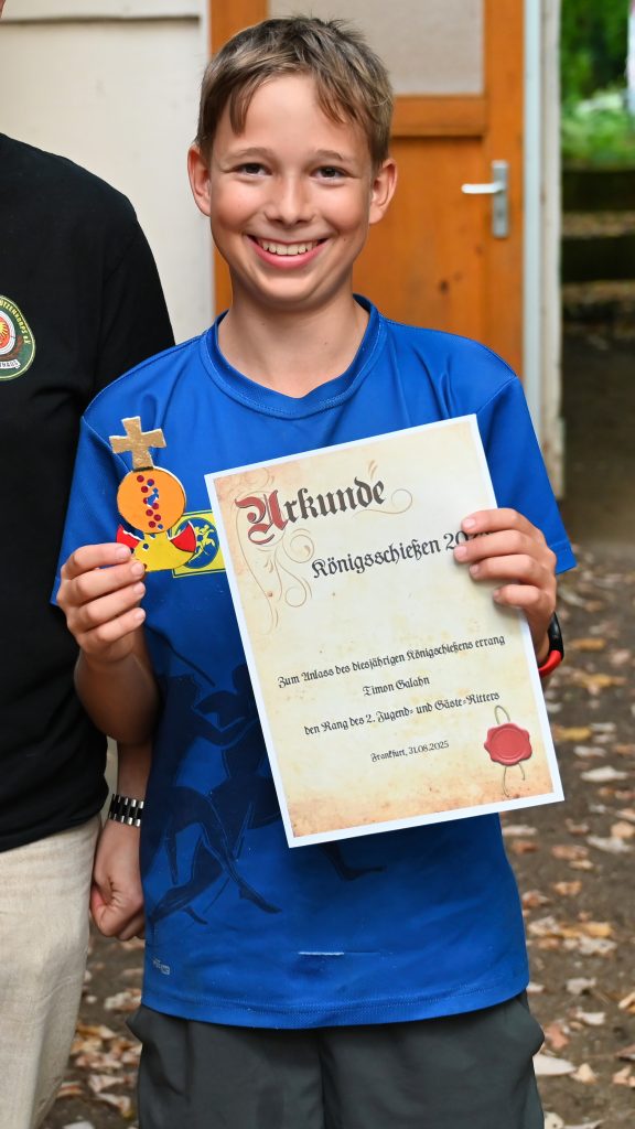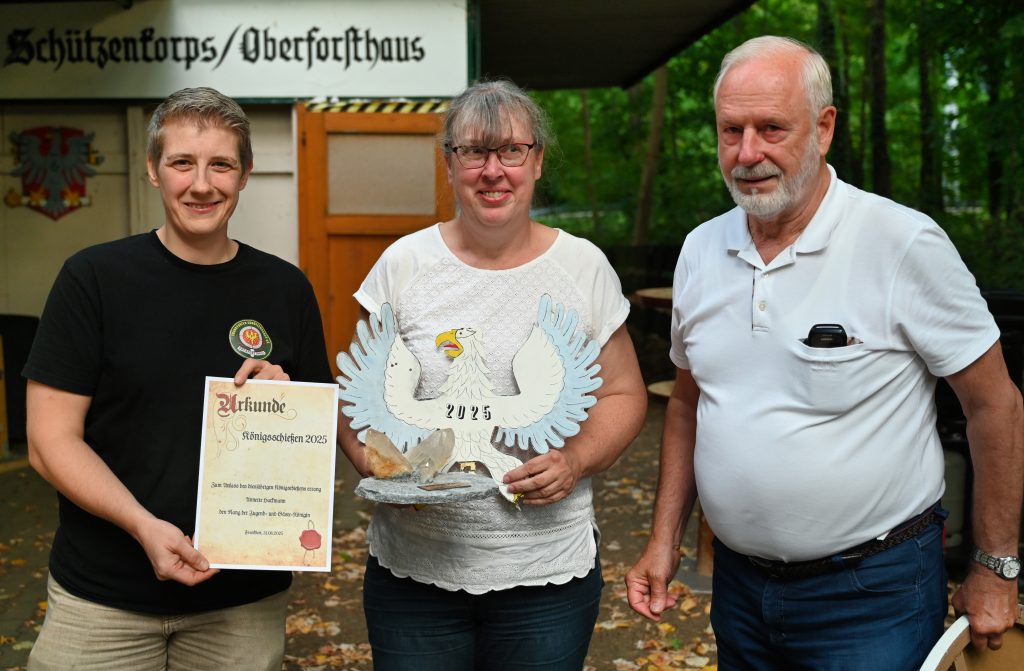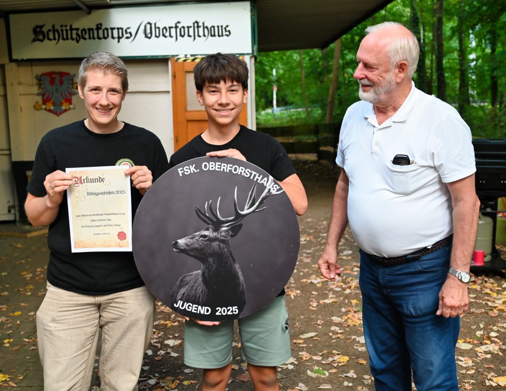 Julius Lourenco-Högl hat das Königsschießen der Gäste und Jugendlichen gewonnen. FSK-Präsidentin Antje Koslowski überreicht ihm die Königsurkunde, Wolfgang Hery die Jugendscheibe.