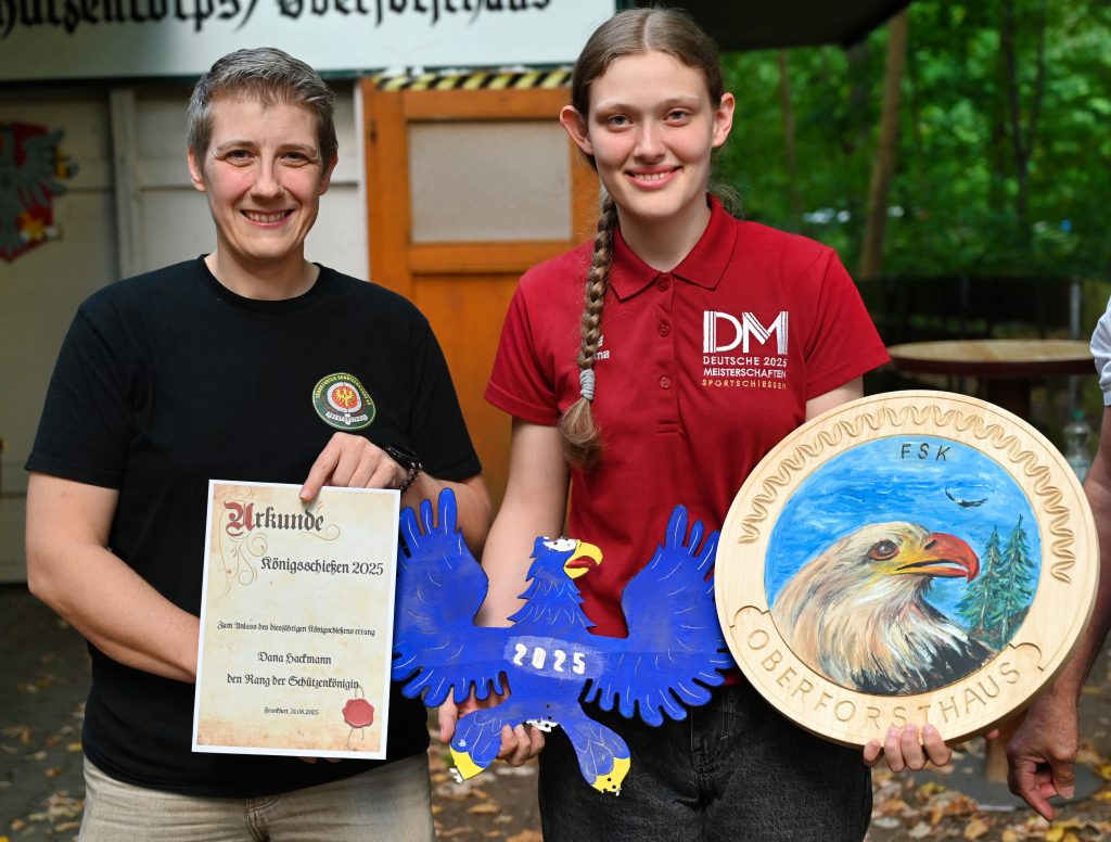 Die neuen Schützenkönigin Dana Hackmann erhält neben der Urkunde den Adler und die Königinnenscheibe.